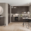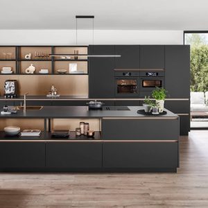 Diese Nobilia Designküche mit Insel Schwarz mit bronzefarbenen Akzenten ist ein echtes Statement für alle, die bei der Küchenplanung keine Kompromisse eingehen wollen. Die grifflosen Fronten mit eleganten Griffmulden in Bronze verleihen der Küche eine moderne, geradlinige Ästhetik, die sofort ins Auge fällt und den gesamten Raum aufwertet. Die Anti-Fingerprint-Beschichtung der matten Fronten sorgt dafür, dass die Oberflächen auch im Alltag gepflegt aussehen und sich unkompliziert reinigen lassen.